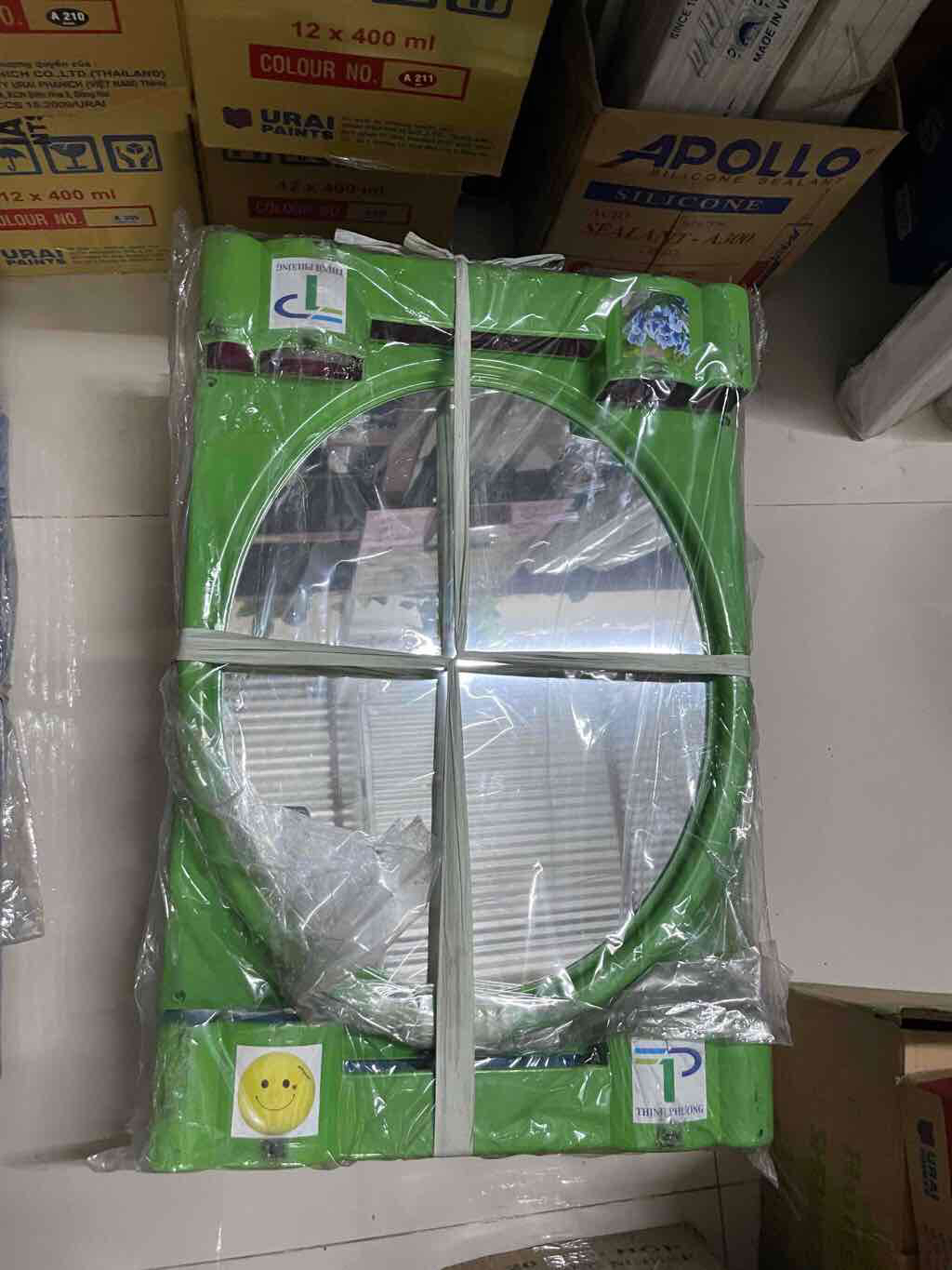 Gương nhà tắm khung nhựa hình elip lớn có lọ cắm bàn chải màu xanh lá, hồng NHỎ