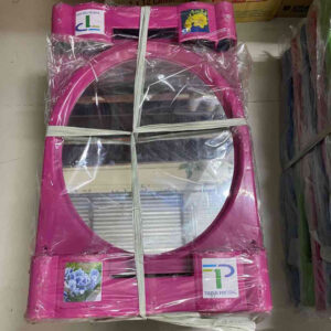 Gương nhà tắm khung nhựa hình elip lớn có lọ cắm bàn chải màu xanh lá, hồng NHỎ